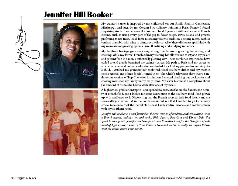 Weaving her love of traditional Southern cuisine with her belief in incorporating healthy, seasonal foods and her classic French training, Chef Jennifer created a unique style of cooking that she terms Modern Southern Healthy Cuisine with a French Accent. Chef Jennifer shares this brand of cooking through her cooking segment ‘Chef Jenn to the Rescue,’ on CBS46’s Atlanta Plugged In, many television appearances, with original recipes in such publications as Waste Not Cookbook, Southern Living Magazine, Garden & Gun and Essence Magazine as well as her Food Network debut as a finalist on Cutthroat Kitchen. Her website, ChefJenniferHillBooker.com provides information about healthy eating, culinary trends, travel, and recipes that reflect her culinary point of view of Modern Southern Healthy Cuisine with a French Accent.
