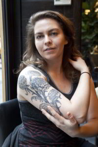 “So I took a year to mull it over, because my friends were like, ‘Look, you’ve been saying this, now you have to, you can’t not do it anymore.’ So I thought about it, and I was like, ‘Well maybe I can get a picture – my grandfather was a painter – maybe I can get something of his.’ And I went to a bunch of tattoo artists, and I kept changing it, but I kept coming back to the idea of artichoke and kale flower, ‘cause when they bloom, they actually turn this beautiful purple color. There was no actual meaning behind them, but I loved them, and I knew that they were important throughout history, and I love eating them, and it’s still related to food. And my mom is always worried about me looking really butch, so I thought, ‘Well, I should get flowers, so if it’s soft enough, then she won’t hate me.’ And I was like, ‘If I’m going to do this, I have to go all in.’