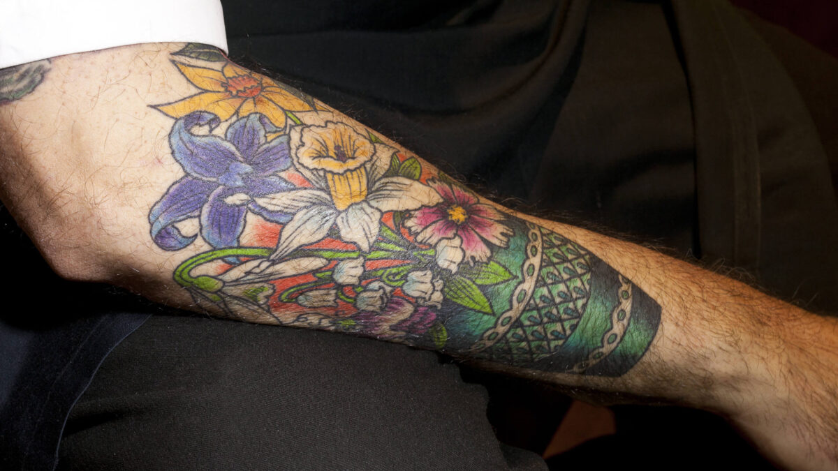 February 10, 2014“It’s a tribute tattoo to my parents, who both passed away, their parents and a brother, who passed away before I was born. There are seven flowers. Each flower is representative of their birth month: my mom’s in December, my dad’s in March, my mom’s father in July, my brother’s in January, my mom’s mom in May, my grandmother’s in October, and my grandfather’s in April. And the colors of the vase are my mom and dad’s birth stone colors. John Sultana at Saved Tattoo in Williamsburg did it.”