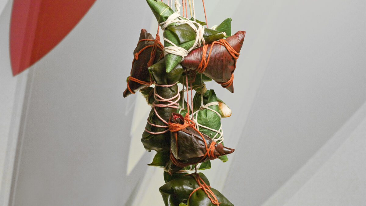 - Fold leaves over the open top of dumpling, then around to side until dumpling is firmly wrapped. Should be pyramid shaped with sharp edges.